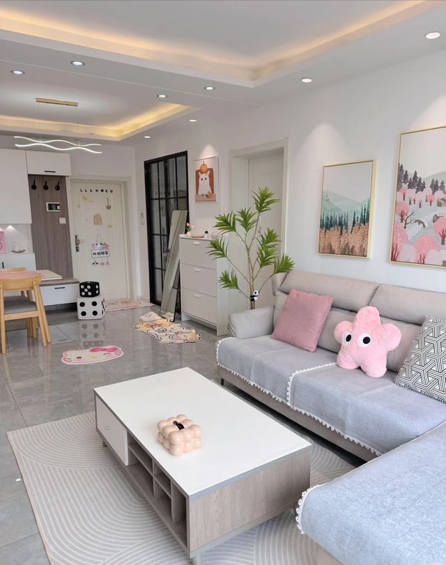 她家客厅布置得很随性,没有固定的“电视+沙发”套路。电视反而是挂在墙角边,平时几乎不开。她更喜欢靠着窗边的小长沙发坐着,听音乐或者写写日记。墙上挂了几幅画,大多是她朋友画的水彩作品,有抽象的、也有写意的,色彩柔和,看着就很舒服。
