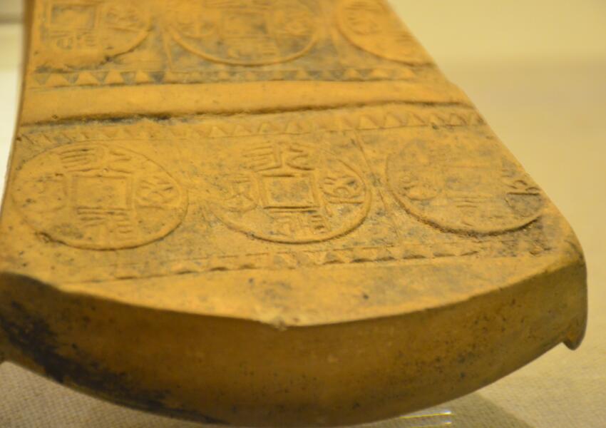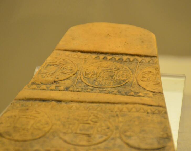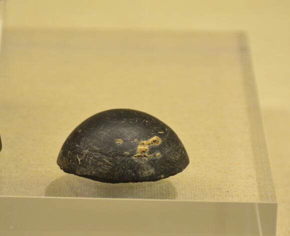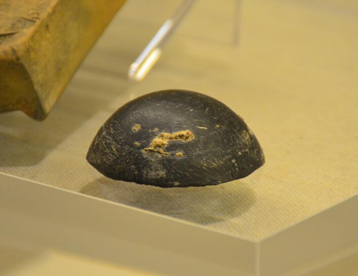 这是唐代的永通万国铭砖箕形砚和黑色的墨球, 永通万国是中国古代钱币的一种,将这种钱币铭在箕[jī]形砚上,箕形砚是唐代流行砚式之一,外形像长方形的箕。 #博物馆#