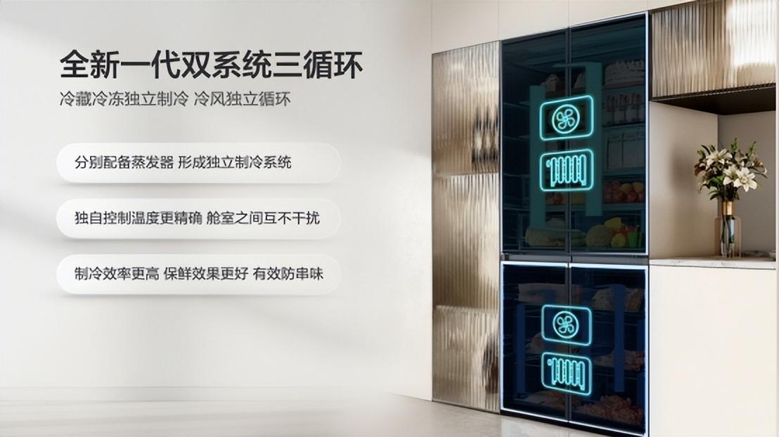 为解决异味及串味问题,TCL T9 Pro搭载双系统三循环技术,冷藏室和冷冻室分别配备单独的蒸发器,两个区域拥有独立制冷系统,各自控制温度。对比单系统冰箱一个蒸发器“肩负”两个舱室的重任,这款双系统冰箱不但让舱室之间互相不受干扰,有效防止食材串味,而且制冷效率更高,温度更稳定,保鲜效果也能更好,食材可以长期保持新鲜和营养。