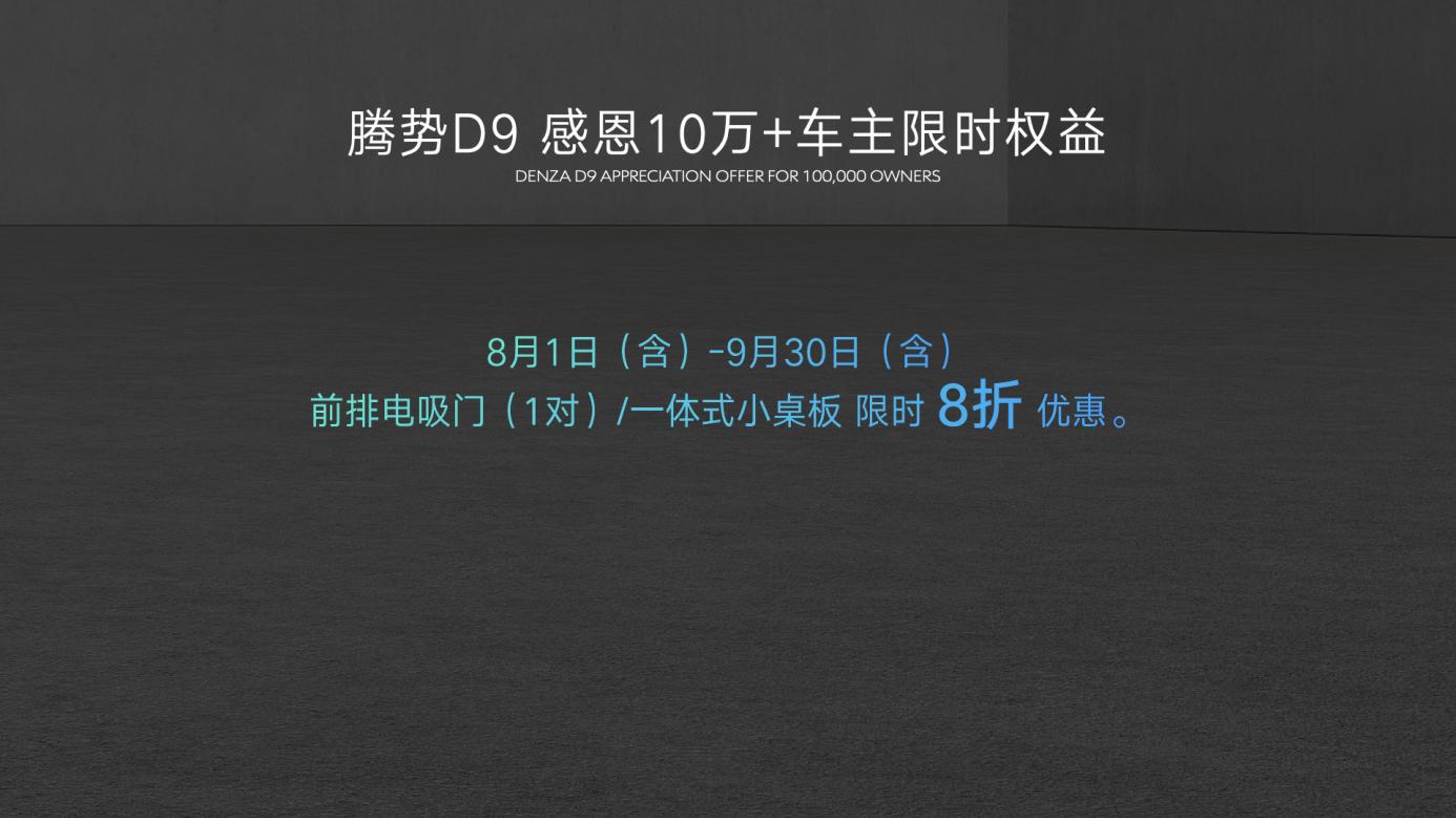 腾势汽车累计用户已经突破10万,在腾势N8的上市之际,腾势10万+用户感恩季正式开启。为满足用户差异化的纯电续航需求,发布会上腾势D9加推款型DM-i尊享型同步上市,纯电续航98km,搭载45kW快充和6kW对外放电功能,售价34.98万元!新车将与现有的190公里、180公里纯电续航版本形成补充,深度满足不同用户所需,持续扩大在MPV市场的领先优势,冲击月销15000+的销量目标。