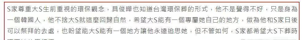 一直以来,树葬的方式是小S提出的,声称这是大S的心愿,说姐姐生前表示想要环保树葬。可这里面存在很大的疑问啊,“想要”,这就像天边那虚幻的云朵,只是一种想法,并不等于事实。就像我们说想要去火星生活,但那也只是想想而已。而且,树葬只是近年才在当地成为一种时尚潮流,大S有这种想法很正常,但不能这就等同于遗愿啊。