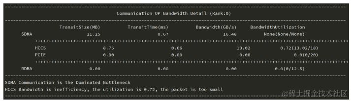 对比该通信算子在各卡上的数据传输耗时 ,得到通信带宽最慢的rank;请计算位于该排名的sdma_bw和rdma_bw,并结合sdma_transit_time和rdma_transit_time,以得出相应的平均带宽。SDMA(System DMA,系统直接内存访问)是一种异步数据传输技术,可以在不占用CPU资源的情况下,实现数据在内存和外设之间的高速传输。RDMA(Remote Direct Memory Access,远程直接内存访问)是一种网络通信技术,其原理是通过绕过操作系统和协议栈的复杂处理过程,直接在网络适配器级别实现数据传输。它将数据直接从一台计算机的内存传输到另一台计算机,无需双方操作系统的介入。这允许高吞吐、低延迟的网络通信,尤其适合在大规模并行计算机集群中使用 。同时,我们会设置一个经验带宽,一般设置为最大带宽的0.8,如图所示。