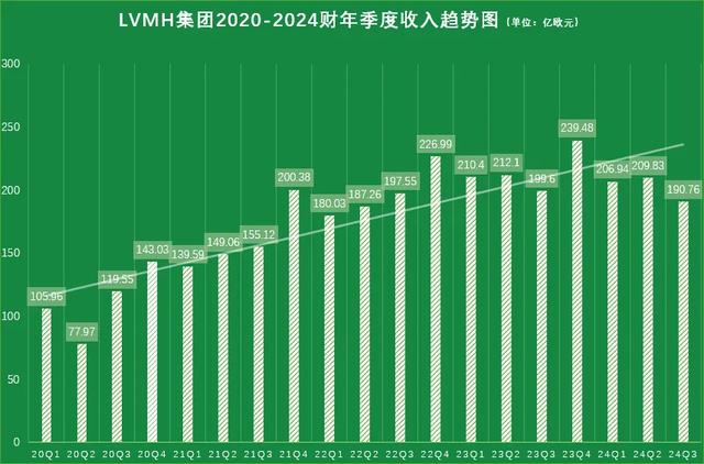 这是自2020年第四季度以来,LVMH集团季度销售额首次出现下滑,也是经历了疫情后几年销售额反弹式「疯涨」的阶段性回落。