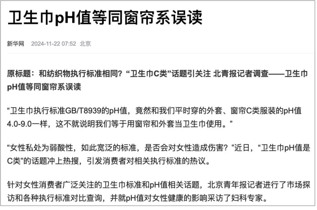 有些网友和自媒体说,当前卫生巾(护垫)的国家标准对pH值的规定为4.0-9.0,跟窗帘桌布差不多,都是在“C类”。