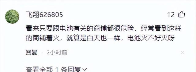 事情发布到了网上后,瞬间引起了不少网友的关注,有网友表示,现在看到和电池有关的商铺都感觉危险,经常能看到着火的新闻,电池着火是真的非常难灭。
