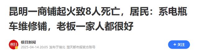信息来源:极目新闻2025-04-14 20:05:昆明一商铺起火致8人死亡,居民:系电瓶车维修铺,老板一家人都很好