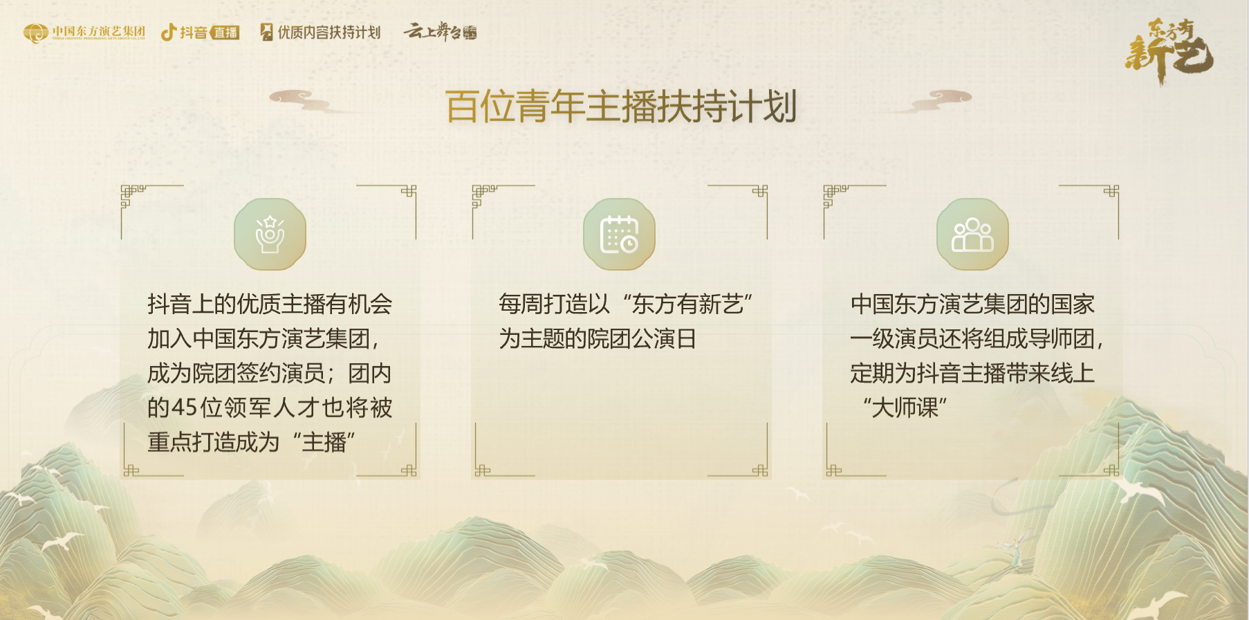 7月31日晚,抖音直播携手中国东方演艺集团举办“东方有新艺”晚会,现场宣布联合发起“百位青年主播扶持计划”。该计划将由中国东方演艺集团提供专业演出指导及顶级剧目资源,抖音直播提供产品和流量支持,共同考核、选拔、培养100位青年主播,未来一年带来2000场专业才艺直播。入选的抖音主播有机会加入中国东方演艺集团、成为院团签约主播,并参演舞蹈诗剧《只此青绿》、舞剧《唯我青白》、音乐剧《大江东去》、音乐诗画《江山竞秀》等。
