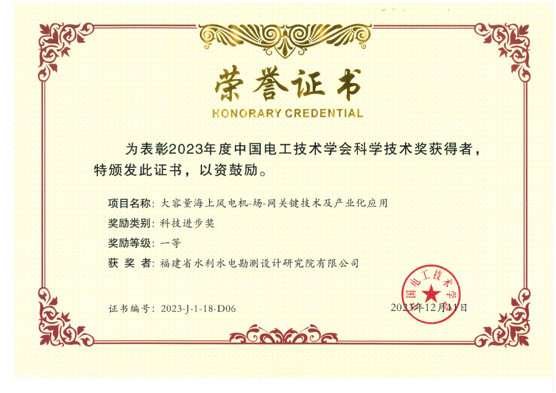 近日,2023年度中国电工技术学会科学技术奖获奖名单公布,由福建省水利水电勘测设计研究院有限公司(以下简称“福建省水电设计院”)与国网福建省电力有限公司、长江三峡集团福建能源投资有限公司等单位共同申报的课题“大容量海上风电机-场-网关键技术及产业化应用”荣获科技进步一等奖。