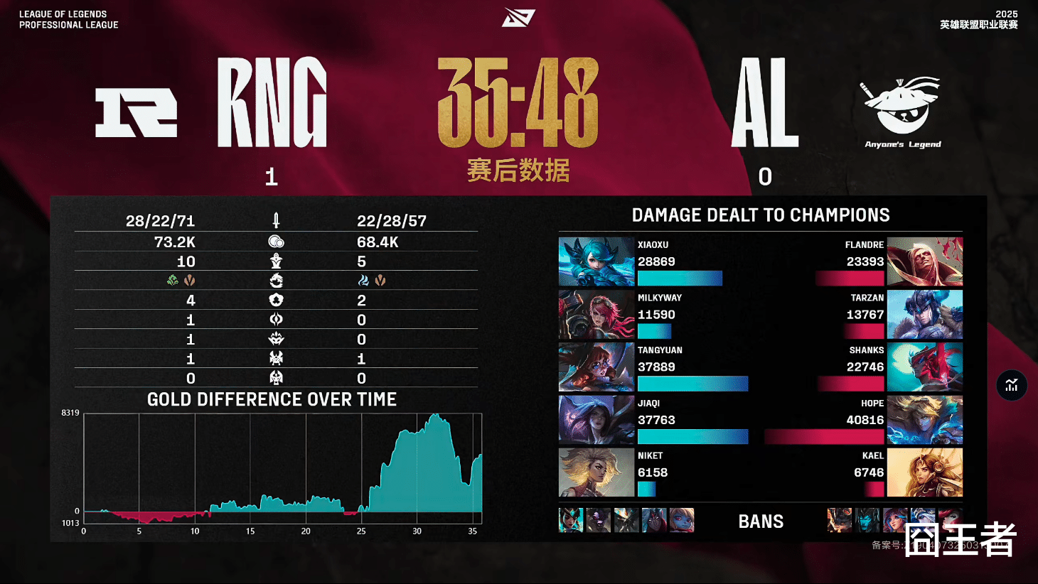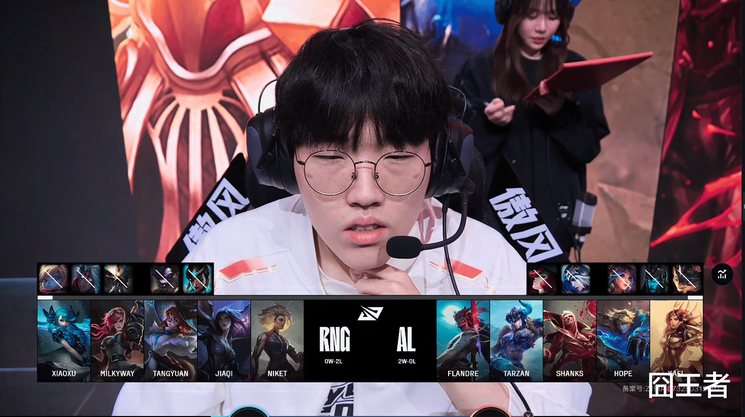 这一局比赛,RNG蓝色方,禁用波比、韦鲁斯、蝎子、牛头、卡尔玛,选用格温、蔚、阿萝拉、卡莎、芮尔;AL红色方,禁用兰博,滑板鞋,莉莉娅,艾希,女枪,选用吸血鬼;猪妹;永恩;伊泽瑞尔;蕾欧娜