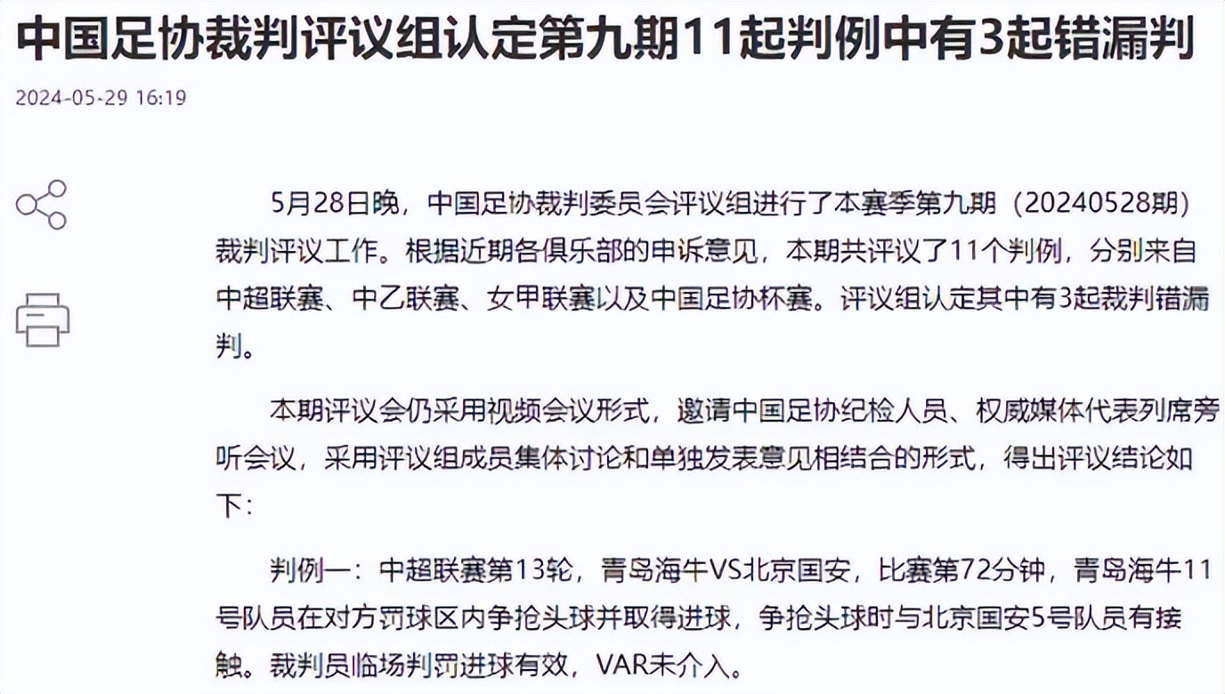 北京时间5月29日,中国足协通过官网公布了裁判纪律委员会的第九期联赛判罚评议结果,针对近期国内各项重要足球赛事中的裁判表现进行了深入分析与评价。