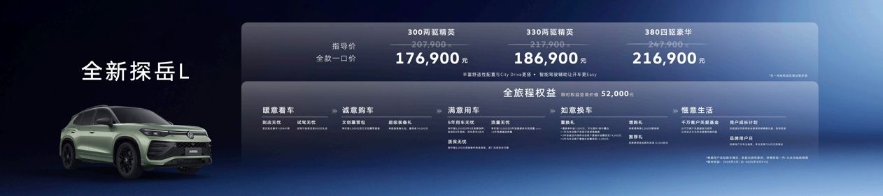 2018 年至今,一汽-大众 SUV 家族累计销量已近 200 万辆,构建了产品数量最多、覆盖领域最广、兼具油电的 SUV 产品矩阵。为感恩千万用户一路同行,值明星 SUV 全新探岳L 焕新之际,一汽-大众还发布了全新IP“探山揽岳”,推出了全新探岳L 的上市权益大礼包,覆盖用户看车、购车、用车、换车等全旅程,总价值超 5 万元,诚意满满。