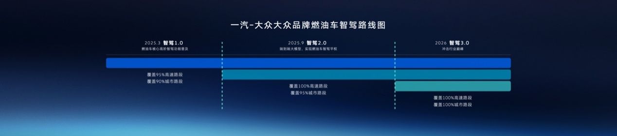 为了响应用户对燃油车智驾发展的殷切期待,一汽-大众制定了行业首个“燃油车三步走”的智驾路线图,全面开启智能化时代。第一步,也就是当前的智驾1.0,普及燃油车核心高阶智驾功能,覆盖全国 95% 高速路段和 90% 城市路段;第二步,在今年第 36 周开启智驾2.0,实现端到端大模型上车,可覆盖全国 100% 高速路段和 95% 城市路段,保证燃油车的智驾平权;第三步,2026 年,开启智驾3.0,智驾功能实现覆盖全国 100% 高速路段和 100% 城市路段,无论是高速上还是城区里,所有路况都能开,为用户带来安心、舒适、高效的出行体验。