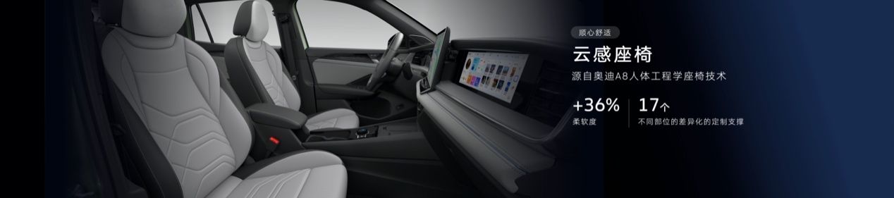 舒适体验上,全新探岳L 配备了专为中国用户研发的云感座椅,座椅柔软度提升了 36%,坐上去可以完全放松。除柔软外,云感座椅还拥有Audi A8 同款人体工学座椅设计,提供身体从靠背到大腿共 17 处不同部位的差异化定制支撑,即使长途驾驶也不感疲惫,让更多用户体验到越级的舒适。