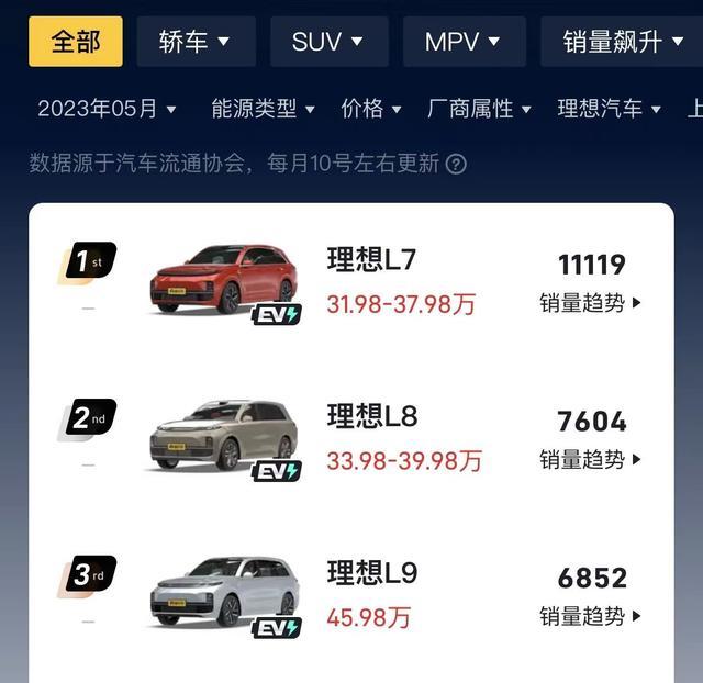 具体来看,理想L7自交付以来销量持续走高,已经连续两个月销量破万,5月份的交付量达到了11119辆,一款30万级的增程式电动车能够月销破万辆,谁不是它是造车新势力独一档的存在呢?作为对比,蔚来在5月份的交付量才6155辆,也就是说理想L7的单车销量都比蔚来的整体销量多出了近一倍,这差距确实越拉越大。值得注意的是,除了理想L7之外,理想L8在5月份交付了7604辆新车,理想L9则交付了6852辆新车,如此优秀的成绩让理想成功跻身造车新势力的金字塔尖儿位置。