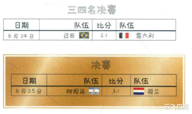 巴西队以2:1战胜了意大利队,从而在本届杯赛中以4胜3平的不败战绩取得第3名;尽管人们同情巴西队,但不能不承认阿根廷队在最后决赛中踢得的确不错。他们的特点在南美洲似乎独树一帜,那就是讲究速度和力量。同时他们也不缺乏球星。如后防中坚帕萨雷拉,中场组织者安德莱斯以及灵巧迅捷的肯佩斯。而荷兰队显然已不再处于顶峰时期,没有了克鲁伊夫,他们在门前机会的把握上已不如从前。这场比赛双方在90分钟打成1:1,肯佩斯进一球。加时赛15分钟时,肯佩斯铲射又进一球,在126分钟贝托尼又使比分变为3:1。阿根廷终于第一次捧得世界杯,受到局势动荡之苦的阿根廷人也因此有了件可以庆祝的事情。