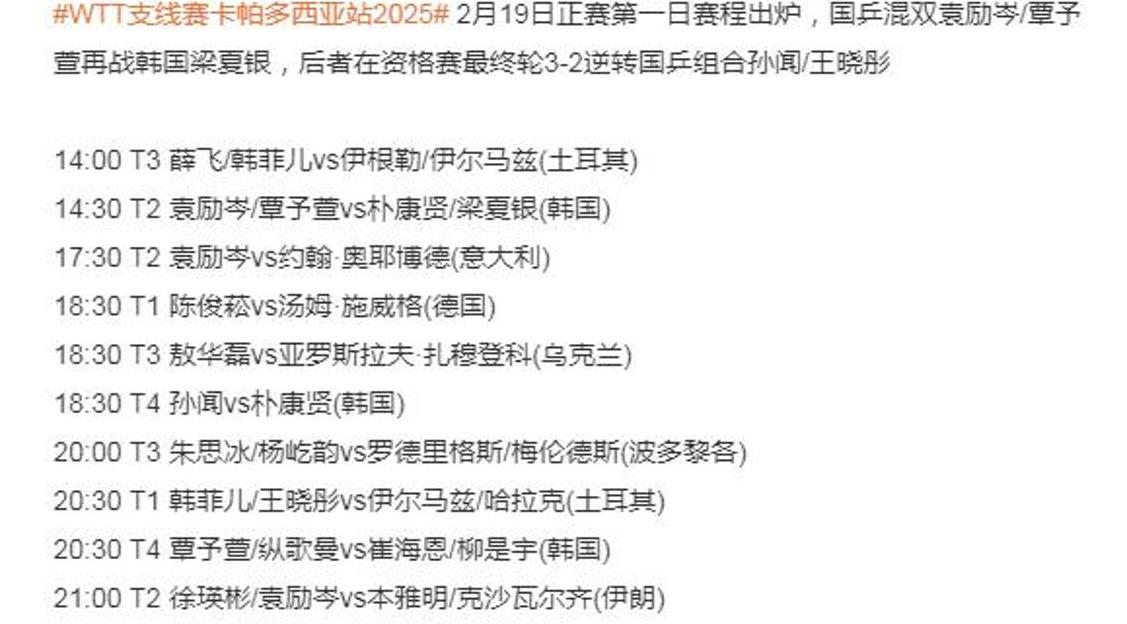 薛飞等三人参加混双和男双2月19日,2025年WTT支线赛卡帕多西亚站继续进行。薛飞与队友韩菲儿、曾蓓勋参加混合双打和男子双打第一轮。此前在新加坡大满贯比赛中,薛飞以3-0击败日本选手张本智和。