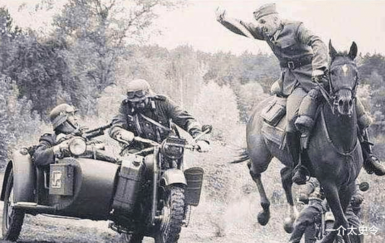 其实德国人在二战中啊,也是有骑兵的,但是数量不多,主要用于侦察跟配合装甲部队穿插行进。二战时期工业水平还是有限的,机械化、摩托化部队并不是所有的德国陆军都能配备上,所以很多德军的部队啊,会用骑兵进行侦察,用骡马运输物资。