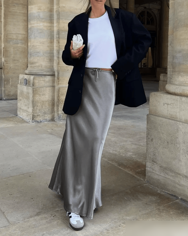 缎面半裙是秋季不可或缺的时尚单品之一, 它不仅具有轻柔飘逸的特点,还能展现出女性优雅的气质,无论是搭配衬衫、T恤还是针织衫,都能营造出不同的风格。
