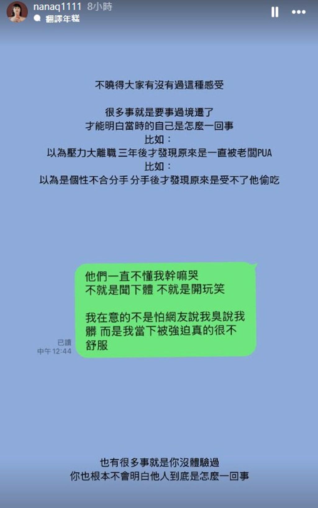 NanaQ 控诉:我也被...就在这节骨眼上,以极简生活出名的网红 NanaQ 突然发声,说自己也遭遇过类似的事情。