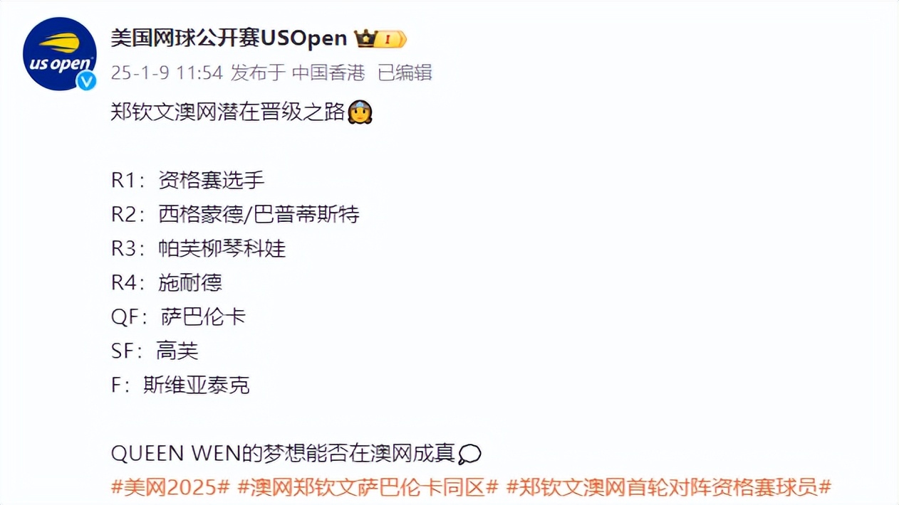 美网也在关注着郑钦文的动态,澳网抽签结果出炉之后,美网赛事官方更新社媒,解析郑钦文在澳网的潜在晋级之路,郑钦文想夺冠可能需要连战前3号种子,而郑钦文的潜在对手细节如下: