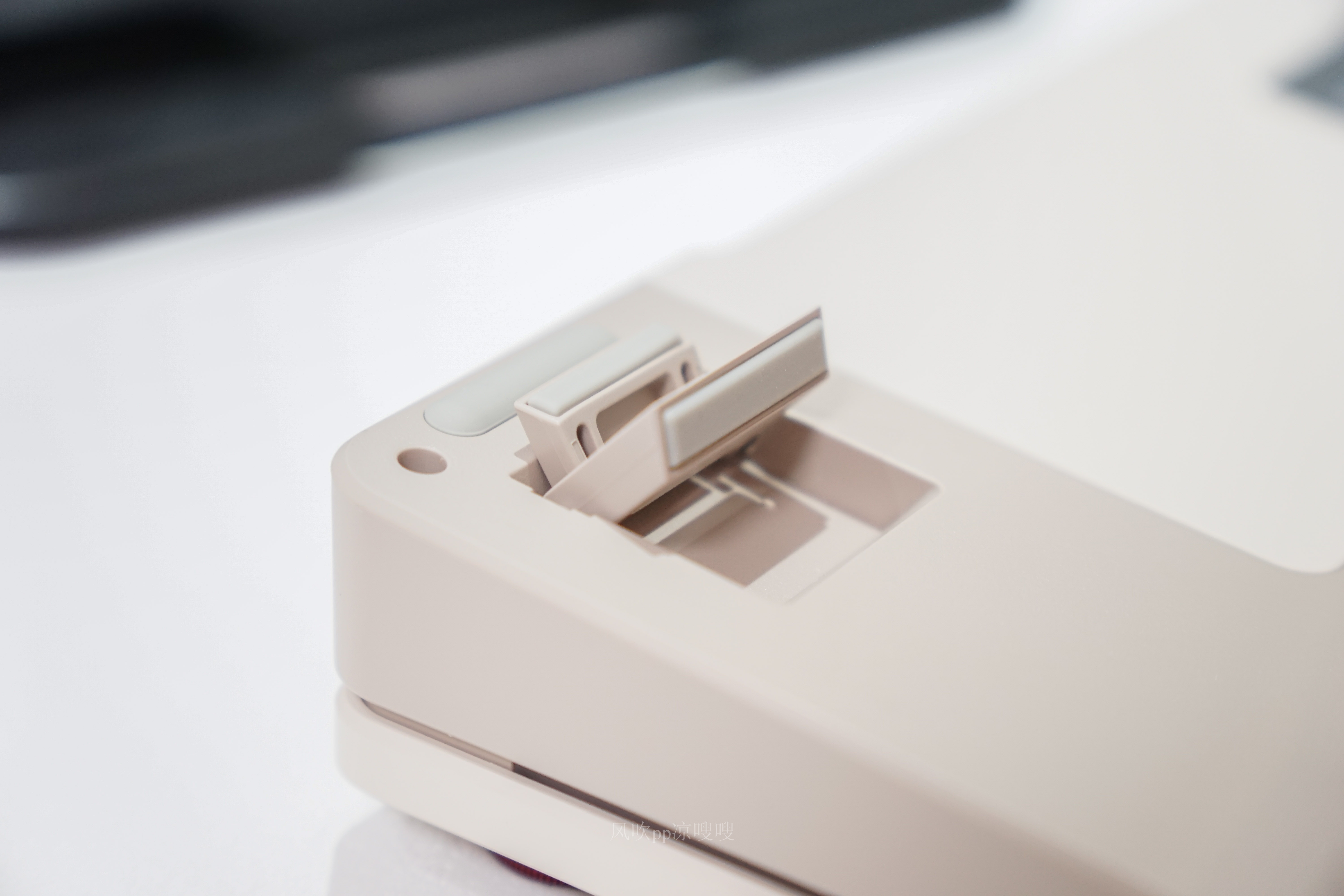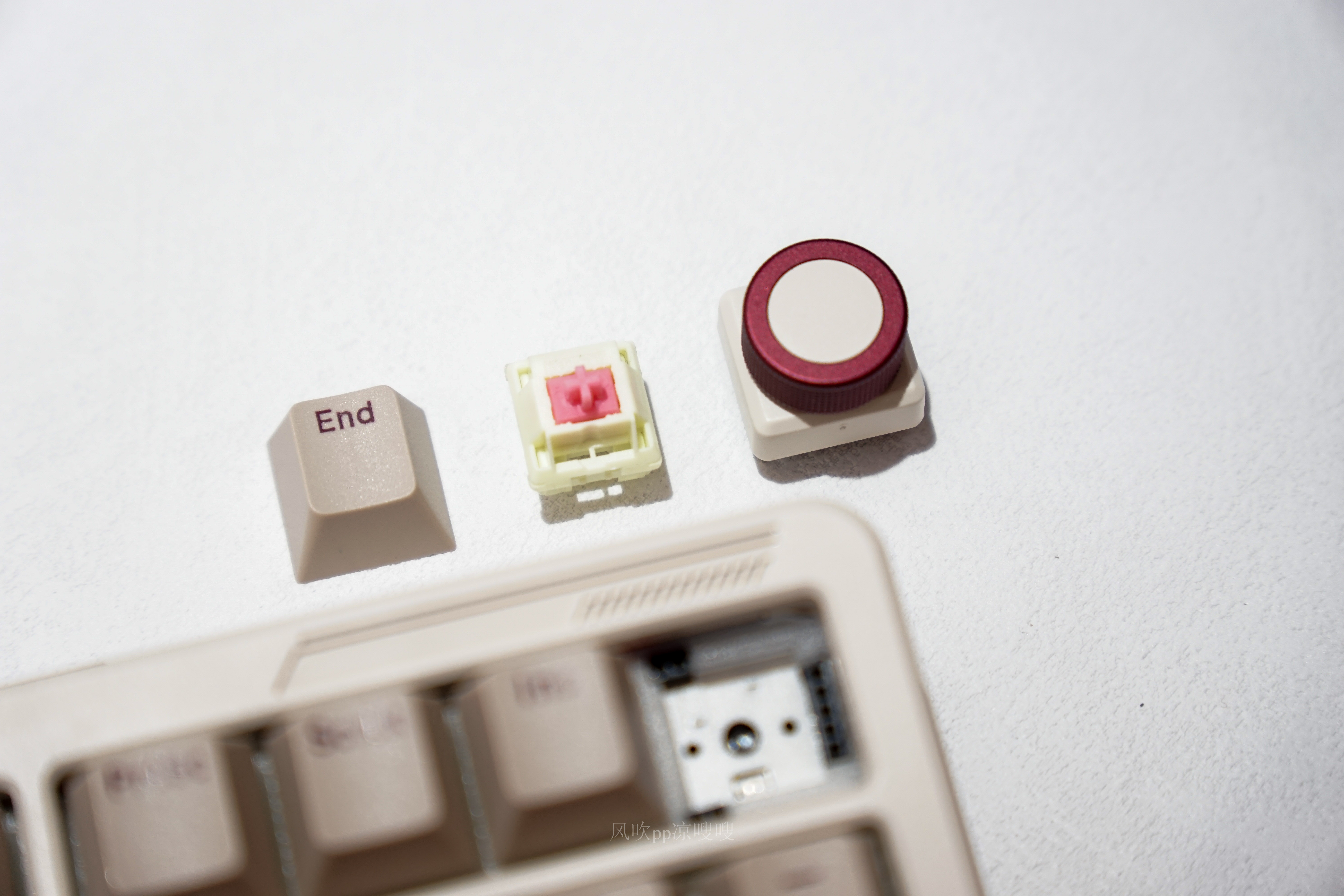 特别有意思的是键盘右上角的End键支持客制化自定义模块,拔除键帽和轴体后可以将金属旋钮插入,这样我们就能使用这枚旋钮调节音量,按压就能一键静音,是不是很方便。