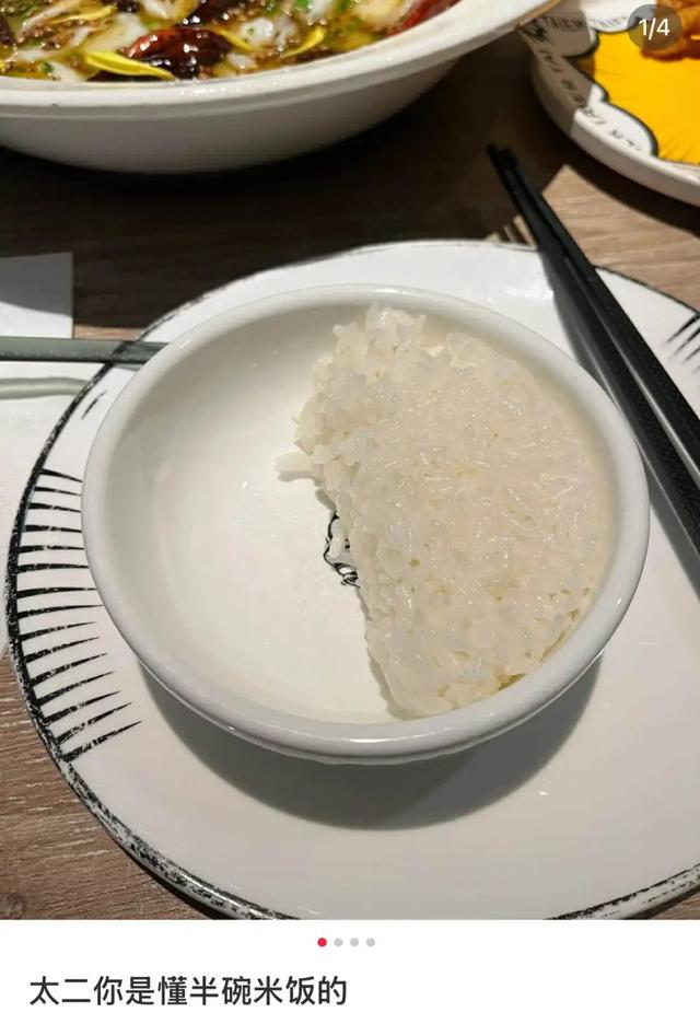 太二酸菜鱼的米饭被评价“湿润软糯、口感劲道”,有人问这米怎么能这么好吃?太二公布了自己的煮饭秘诀,“煮米的时候放一包油,一包醋盐,350ml饮用水”。太二还卖起门店同款米,1.8kg一箱的米55元,看价格是“米中贵族”,名字也起的玄乎:“太二大力米”,其实就是五常大米。一顿操作下来,半碗米饭标价3块钱,吃一口感觉旁边的酸菜鱼都不配。