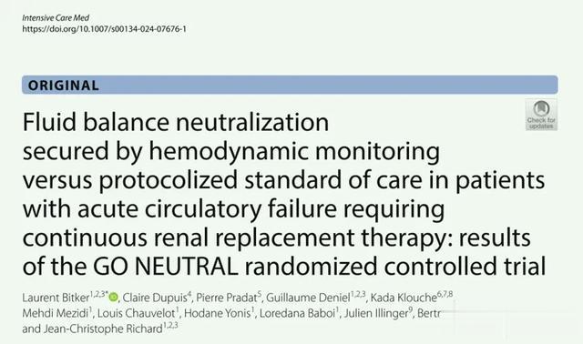 在本期《重症医学》杂志上,Bitker 等人报道了 GO NEUTRAL 随机临床试验结果,该试验研究了在功能性血流动力学监测 (FHM) 方案指导下的体液平衡中和与标准治疗的对比,适用于需要持续肾脏替代治疗 (CRRT) 的 AKI 和急性循环衰竭重症患者。该试验是一项多中心、开放标签、平行组研究,共有 55 名接受血管加压和 CRRT 治疗的患者参与。参与者被随机分配接受使用 FHM 方案调整的 UFNET ≥ 100 mL/h(干预)或 UF NET 速率≤ 25 mL/h(对照)。主要结果是 72 小时内的累积体液平衡,在修改后的意向治疗人群中进行分析。作者发现,干预组 72 小时的累积体液平衡为-2650(四分位距[IQR],- 4574 至-309)毫升,对照组为 1841(四分位距[IQR],821 至 5327)毫升,差异具有统计学意义。不过,两组在血液动力学、氧合、72 小时低血压发作和死亡率等次要结果方面没有差异。