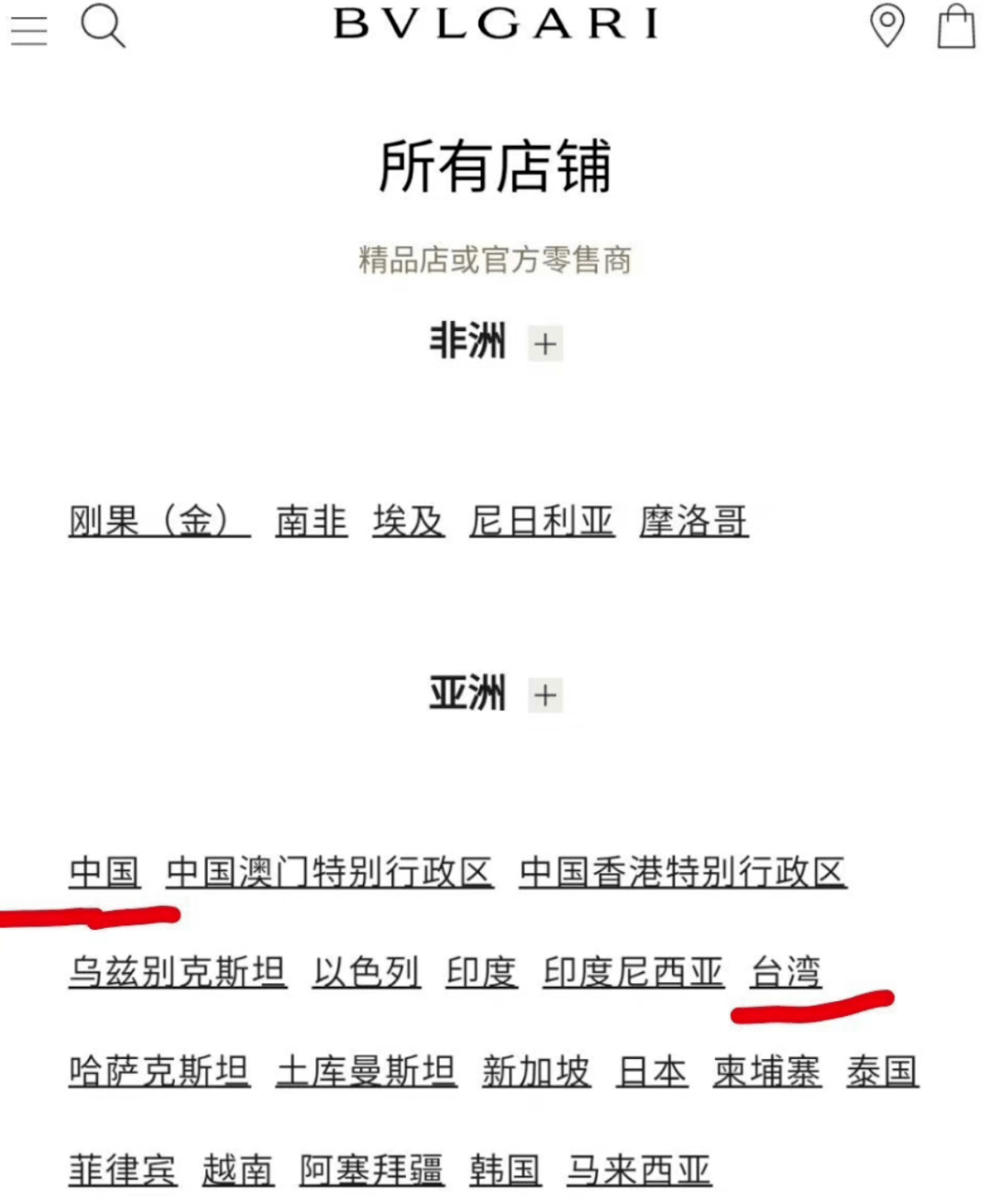 奢侈品牌宝格丽,被网友发现,它家进行地区国家分类时,将中国与台湾并列。