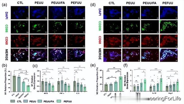 CD86是一种共刺激分子,通常被认为是M1巨噬细胞(促炎巨噬细胞)的标志之一。从图4a的荧光染色可以看出,PEUU/FA组和PEFUU组的CD86的荧光强度较弱。与M1相关的蛋白质水平的统计数据也可以有效地证明这一点(图4b)。从图中可以看出,PEUU促进M1细胞极化的程度与空白对照组相同,而PEUU/FA和PEFUU能有效地阻止巨噬细胞极化为促炎症反应的M1表型。其中,PEFUU因其分子量分布更均匀、结构更均匀而具有较好的抗炎作用。图4d显示IL-4和IL-10诱导的巨噬细胞的免疫荧光染色。PEUU/FA组和PEFUU组CD206水平较高,提示FA的加入促进了M2巨噬细胞表型的极化。图4e中巨噬细胞相关蛋白的表达水平也证明了这一点。图4f显示了M2巨噬细胞相关炎症因子的表达水平统计,PEFUU组有更多的M2细胞。M2细胞可以起到抑制炎症的作用,因此其较高的极化水平促进了血管愈合。巨噬细胞实验结果表明,PEFUU作为血管移植材料具有很好的抗炎和抗氧化作用。