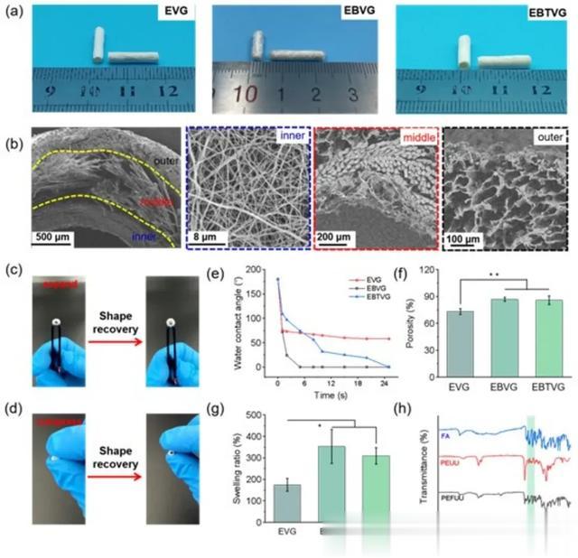 血管移植物的三维结构与血管组织的再生效果密切相关。宿主细胞早期募集移植物可以促进组织形成;因此,高度相互连接的孔结构对细胞渗透非常重要。此外,以前的研究已经认识到,根据移植物的孔结构和孔径来调节炎症反应可以是促进组织重建的有效解决方案。因此,作者设计了一种具有分层结构的小直径血管移植物,其结构模仿了天然血管的三层结构。如图1a所示,采用具有良好强度和弹性的编织管状PLGA织物作为EBTVG的机械支撑。这在植入后的早期阶段作为机械支撑,然后被降解以产生更多的孔洞,促进宿主细胞生长到EBTVG的壁上。内层是一种仿生ECM-电纺聚(酯-阿魏酸-氨酯)尿素(PEFUU)纤维,为内皮细胞的黏附和增殖提供了一个活性部位。外层是蓬松、海绵状的PEFUU基质,具有微孔和柔软、弹性的机械性能,可促进细胞分化和增殖,并分泌细胞外基质,以弥补因材料降解而迅速失去的机械性能。此外,PEFUU基质具有多孔和连通的结构,可以快速动员身体向血管周围组织招募干细胞。更重要的是,这种蓬松的海绵基质可以促进毛细血管通过EBTVG壁渗透到周围组织,并渗透到血管移植物中,促进血管再生,有利于血管内皮细胞的再生。如图1b所示,构建的血管移植物具有与天然血管相似的结构,这些血管具有不同的孔大小,促进内皮细胞和平滑肌细胞的再生。该物质的抗炎作用可促进M2巨噬细胞极化,从而有效促进血管组织再生。