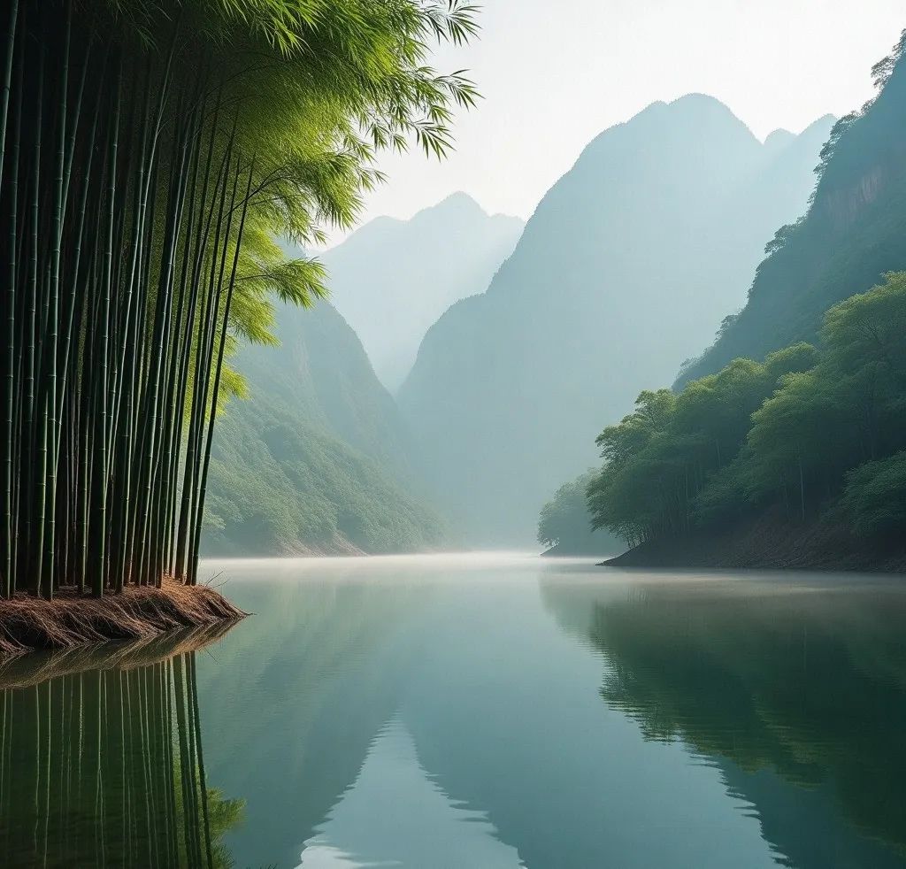 竹泉响露,高岭碧湖出,柔涛轻雾。