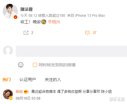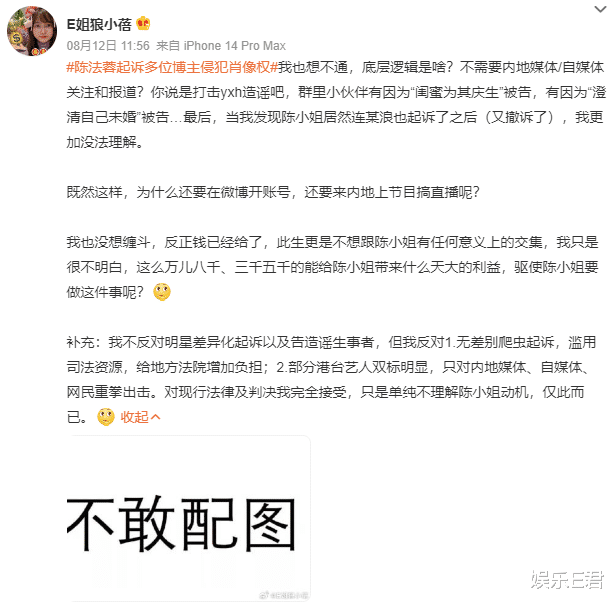 陈法蓉本人暂时没有回应,8月17日早上8点多,她还在发微博向粉丝说晚安,但在微博下,还有网友在吐槽:“起诉自媒体得了多少钱收益啊?分享分享呗。”
