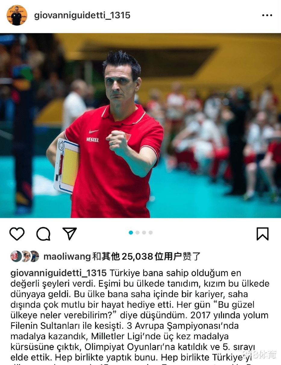 11月19日消息,当地时间11月18日,土耳其排协宣布与土耳其女排主教练古德蒂提前解约,后者结束了5年执教。古德蒂随后在社交媒体上发长文,深情地告别土耳其队。