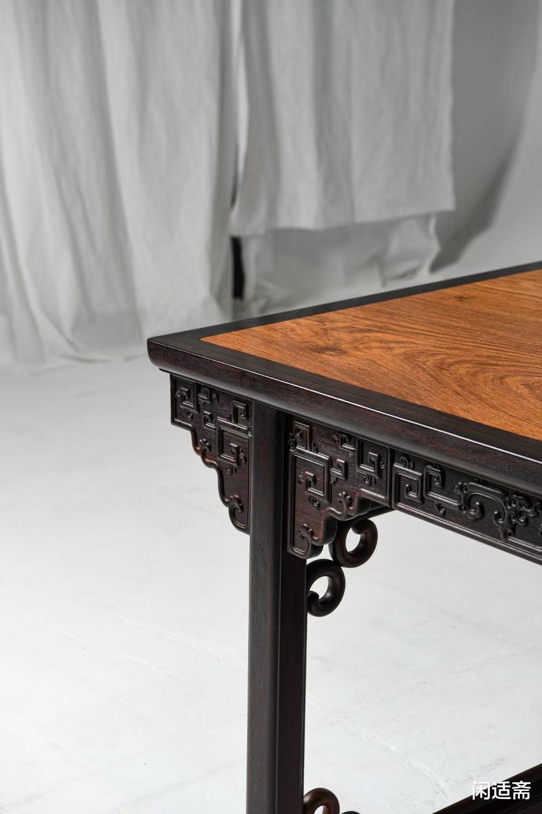眼前这件紫檀黄花梨复刻漱芳斋款画案,无疑是古典家具中的精品 。整体以紫檀木为基,紫檀木质地浑厚坚实,历经岁月洗礼,包浆醇厚,散发着沉稳大气的气质 。整器制作工艺考究,案面采用窄边框攒接黄花梨面芯的工艺,黄花梨木性稳定,一木对开,纹理清晰雅致,色泽温润,为画案增添了一抹清新灵动之气,恰似文人墨客笔下流淌的墨痕,淡雅而富有诗意 。