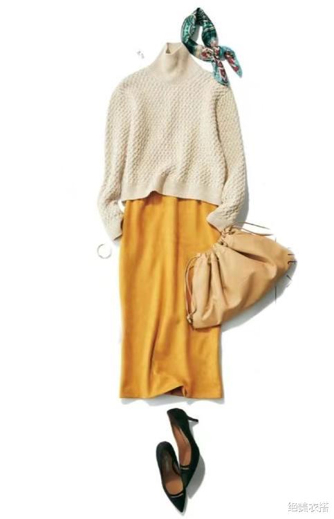 而这件米色大毛衣的配色思路,也在顺势而为的基础上发挥。米色+黄色,再点缀小面积绿色丝巾,鲜活,有动感。