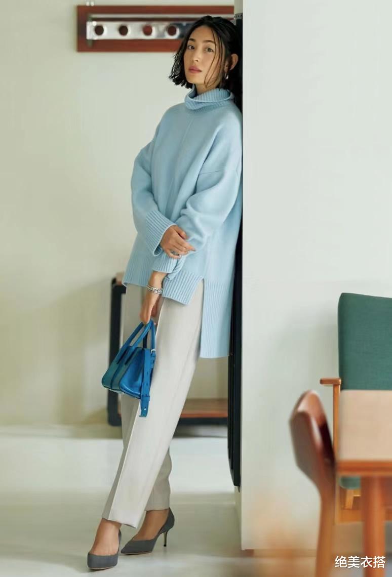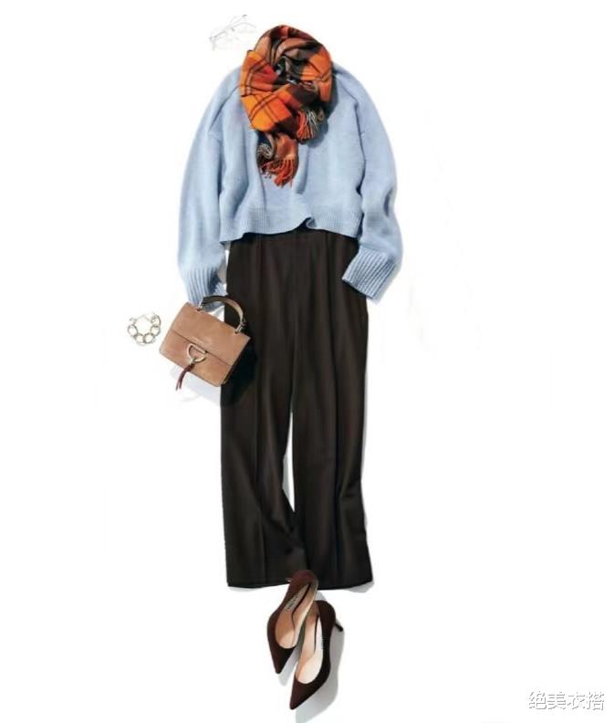 爽朗浅蓝色毛衣,短款,最合适搭高腰阔腿裤,将完美腰线比例,刻画出立体感。略显单薄的上身,加条橙黑拼色大围巾吧。