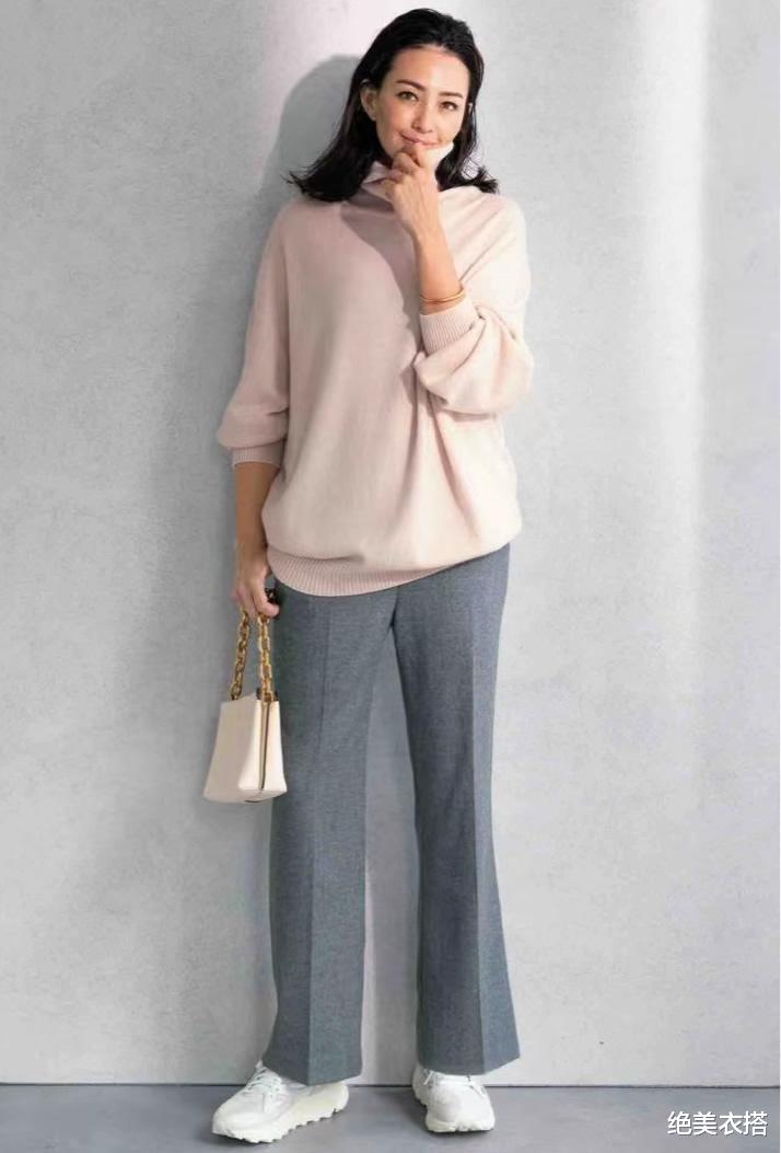 除低纯度,淡米粉色毛衣+明黄色阔腿裤的配色思路,与上面一样,都是借助米色+黄色的天性,顺势而为。