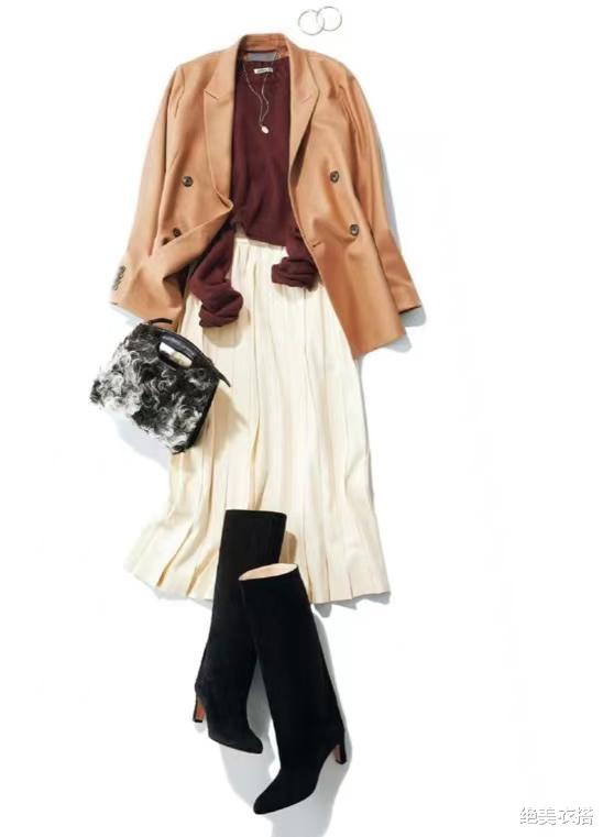 下图中,酒红色毛衣+驼色外套,用深浅不一的纯度来顺应。再调和以白色半裙,优雅女人味托盘而出。