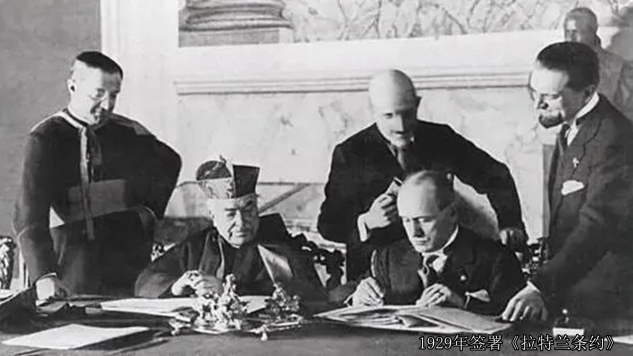 和教会的谈判旷日持久,1926年墨索里尼提出和教皇直接谈判,庇护十一世欣然接受。经过2年多的讨价还价,断断续续,双方于1929年签署《拉特兰协定》,这份协定包括三个部分,涉及政治、教约和财政。协议规定:意大利以罗马天主教为唯一国教;宗教教育从公立小学扩展到中等学校;意大利承认教廷在国际事务上有独立的主权,并正式划定了梵蒂冈的范围,教廷在梵蒂冈行使权力时,意大利政府不得有任何干涉。