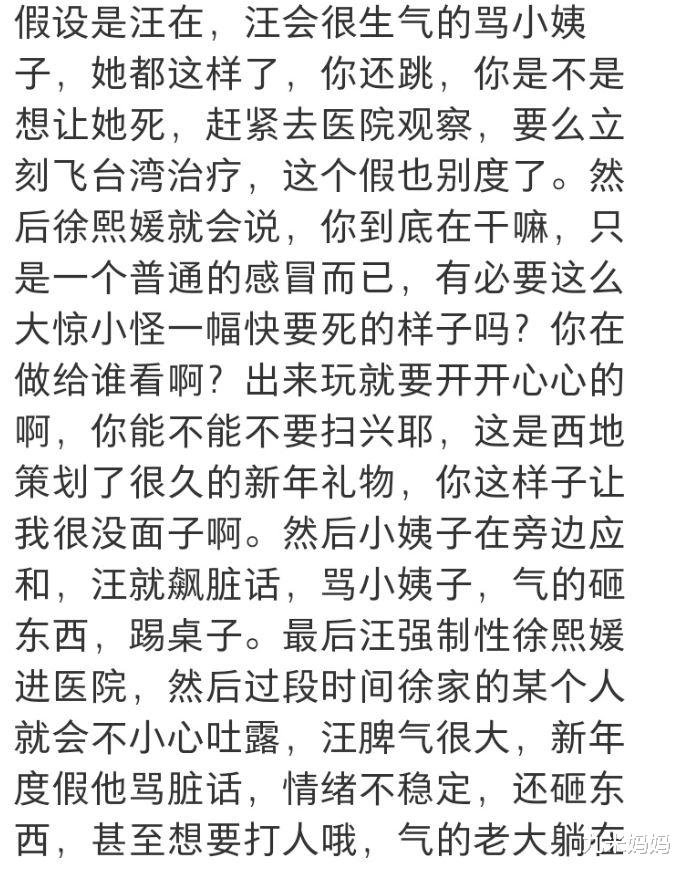 就像网友说的那样,如果汪小菲在身边,大S就不会死。有网友根据汪小菲、小S和S妈以前做事的风格,以及说话的语气,假设了一下如果这次汪小菲也跟着去旅行了,他看到大S生病会如何说话,如何做。