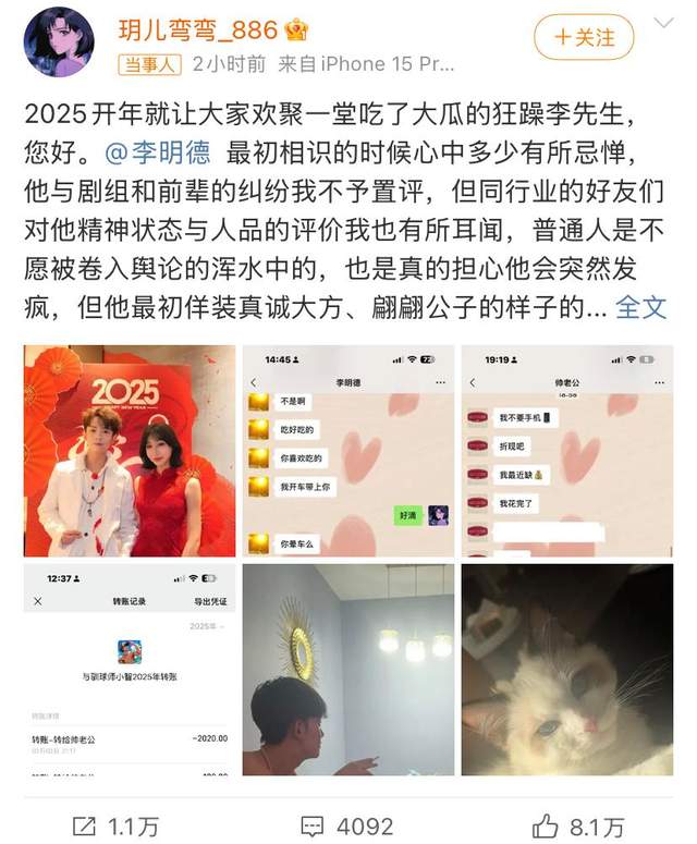 前女友在社交媒体上发文,怒斥李明德脾气反复无常,患有被害妄想症,并且还存在砸路边车辆的行为。这一爆料迅速引发了网友们的广泛关注和热议。