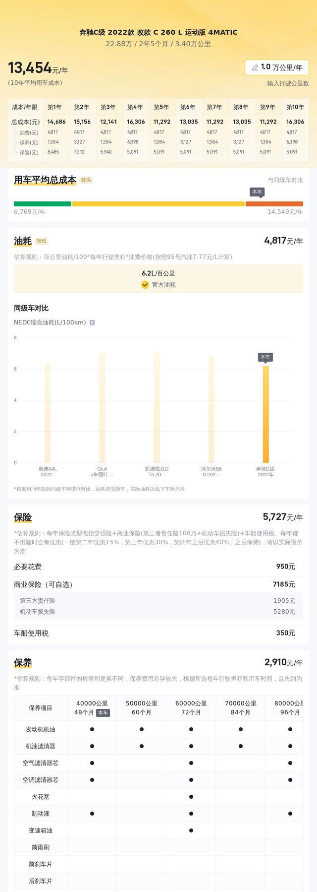 谈及用车成本,无论是豪车还是经济车,二手车的长期使用成本是消费者不得不考虑的重要因素。针对这辆奔驰C级而言,估算的年均综合使用成本大致在1.3万元。对于拥有豪华品牌的四驱车型来说,这个数字显得并不高。同样,较高的市场保值率意味着,在未来数年内,该款车的贬值幅度将降低,消费者可以在豪华驾驶体验与经济压力之间取得某种平衡。这种符合消费者期待的优势,很容易让潜在买家充满信心。