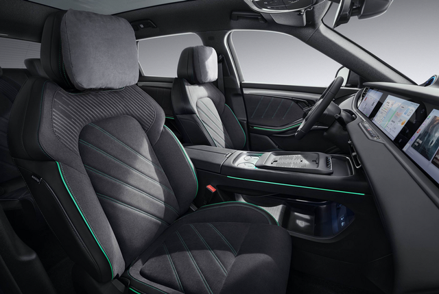 此外,车厢里还配倍了云柔头等舱座椅、后舱Calf小牛皮套装、34英寸4K隐藏式升降屏等,十分奢华。