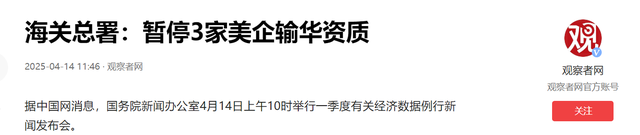 观察者网在2025-04-14关于《海关总署:暂停3家美企输华资质》的报道