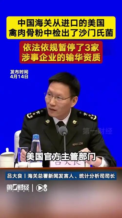 近期,海关总署宣布从进口的美国禽肉骨粉中检出沙门氏菌,依法依规暂停了3家涉事美国企业的输华资质,并向美国官方主管部门进行了通报。
