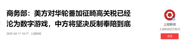 参考资料:上观新闻在2025-04-11关于《商务部:美方对华轮番加征畸高关税已经沦为数字游戏,中方将坚决反制奉陪到底》的报道