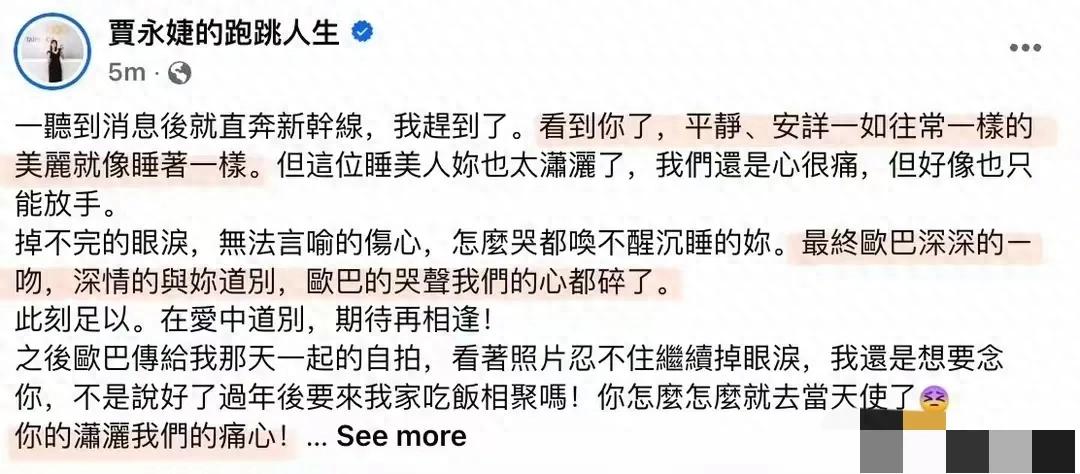 大S挚友贾永婕还原了她临终时的画面,称她像睡美人一样安详,表情平和温柔。