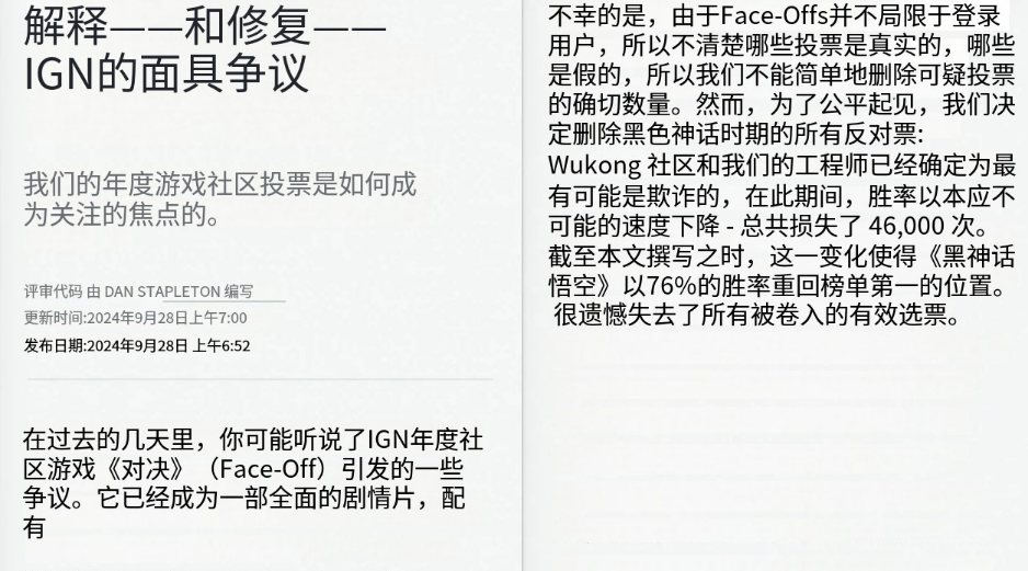9月28日,《黑神话:悟空》重新回到了IGN年度游戏投票榜的首位。然而,这个过程并不平静。IGN官方发布声明,称他们删除了不合理的4600张反对《黑神话:悟空》的选票,并解释了这一决策的原因。
