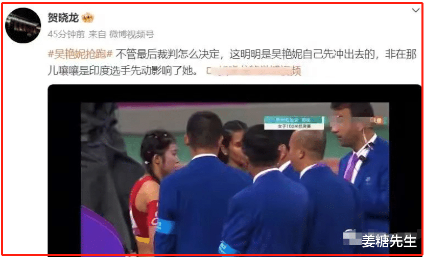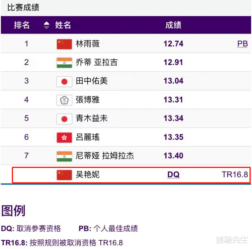 但是,裁判们在经过10分钟的讨论后,最终认定吴艳妮抢跑,取消比赛成绩。