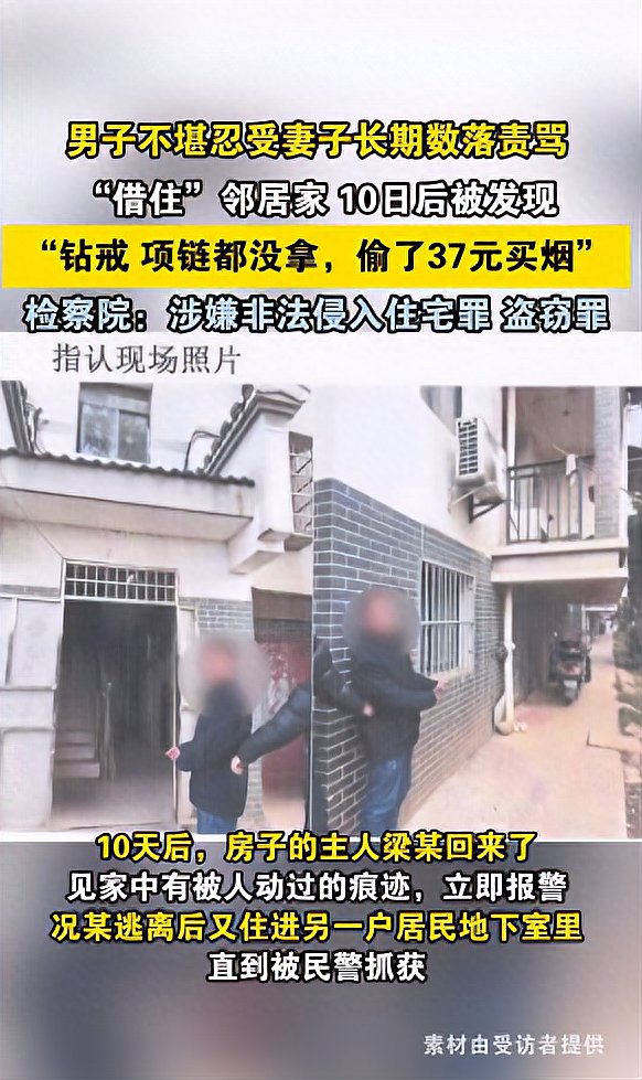 2024 年底,江西高安的冬天格外阴冷。45 岁的况某蜷缩在地下室的硬板床,听着楼上妻子隔着楼板传来的辱骂声,麻木地点燃一支烟。自 2024 年下半年起,因不堪忍受长期精神虐待,他被迫与家人分住,却在 12 月做出了一个荒诞举动 —— 翻墙进入长期无人的邻居家,住了 10 天,用对方的电饭煲煮饭,临走时偷走 37 元现金买烟。直到房主梁某回家发现异常报警,民警在另一处地下室将他抓获。高安市人民检察院审查认为,其行为已涉嫌非法侵入住宅罪与盗窃罪。
